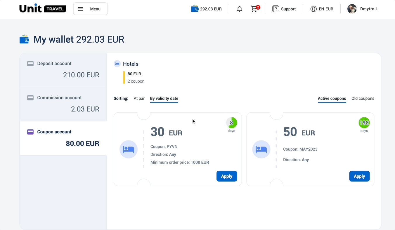 The coupon account is displayed in the Wallet tab at the top of the Unit Travel website. When you go, you will see a menu with different accounts, among which there will be a Coupon account.